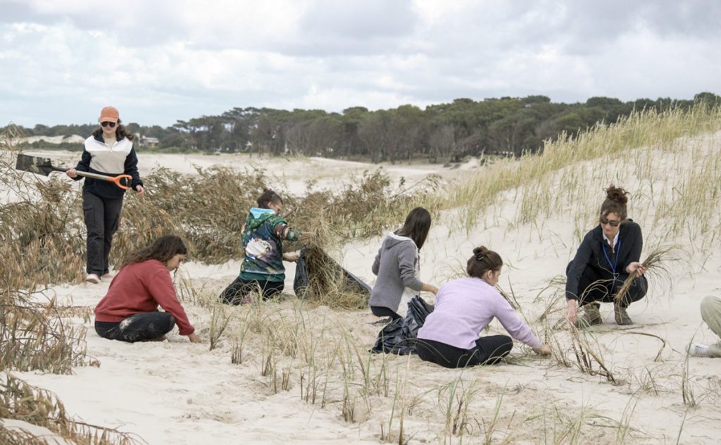 Plantación de 2.200 plantines de pasto dibujante (Panicum racemosum) para la recuperación del cordón dunar en la desembocadura del arroyo Solís Chico, Las Vegas, realizada en la Segunda Jornada Encuentro Costero 2026.