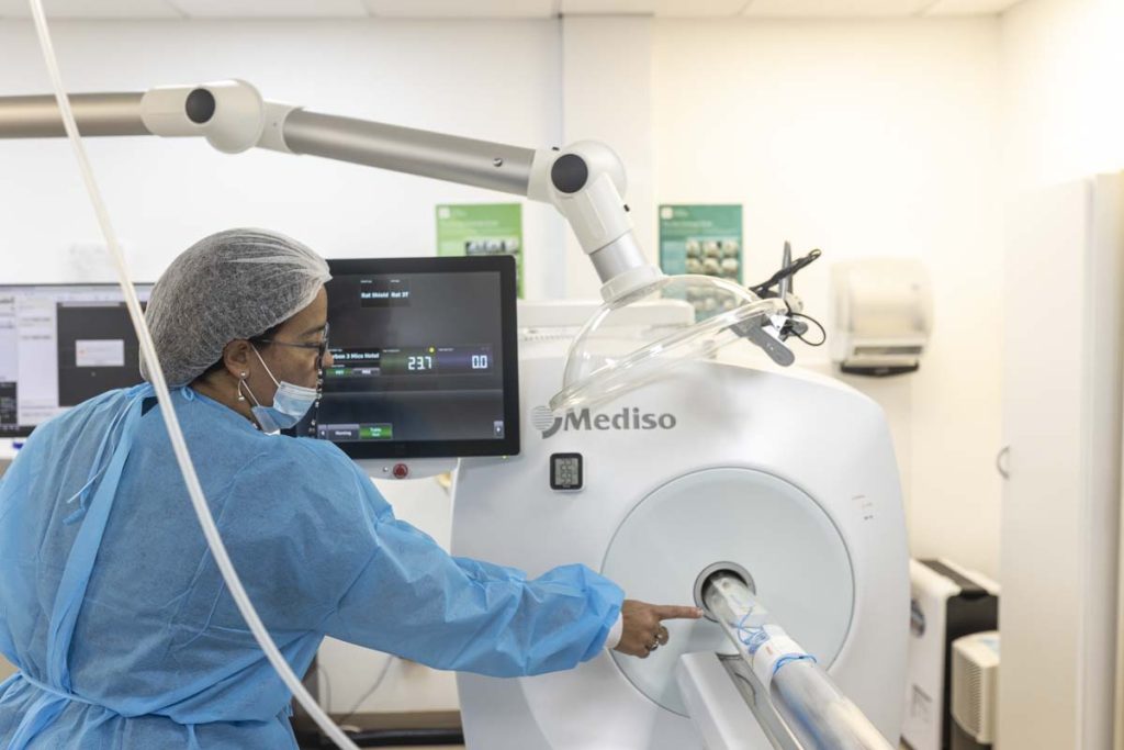 En otra sala del centro, decenas de ratones –algunos sanos, otros modificados genéticamente con la enfermedad– forman parte de ensayos que utilizan la misma tecnología de última generación, pero a una escala diminuta. Sobre una camilla adaptada a su tamaño, uno de los ratones es introducido en un resonador de alta potencia. Con estos dispositivos, los científicos que trabajan en el área preclínica observan cómo avanzan los cambios en el cerebro y ensayan posibles estrategias para frenar el daño neuronal.