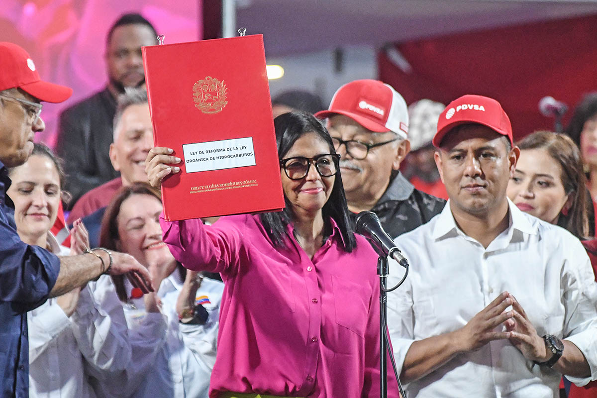 Delcy Rodríguez en un acto luego de la aprobación de la reforma de la Ley de Hidrocarburos, en Caracas, Venezuela, el 29 de enero. Xinhua, Marcos Salgado.