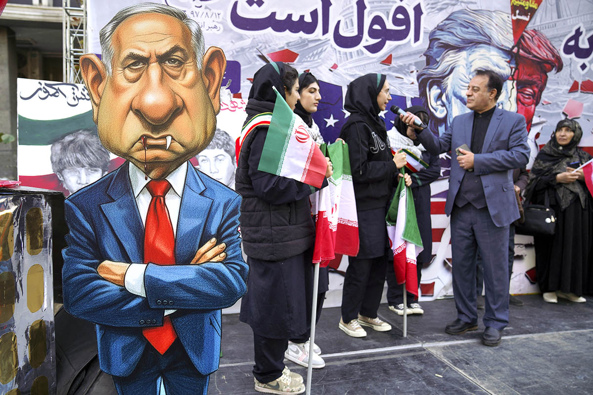 Caricatura de Benjamin Netanyahu en el exterior del antiguo complejo de la embajada estadounidense en Teherán, Irán, el 4 de noviembre de 2025. AFP, Middle East Images, Yar.