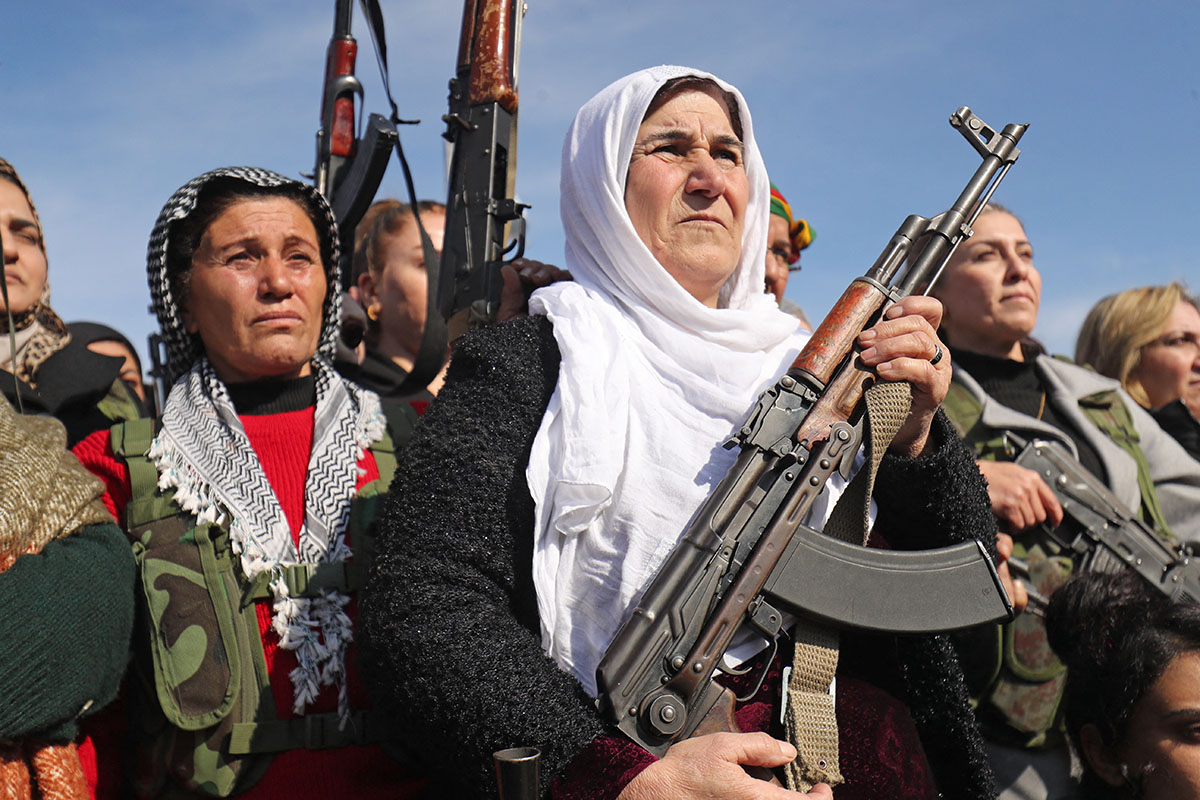 Civiles kurdos se reúnen con sus armas en la ciudad de Qamishli el 20 de enero a raíz del llamado de las Fuerzas Democráticas Sirias a jóvenes, hombres y mujeres kurdos a unirse a las filas de la resistencia. AFP, Delil Souleiman.